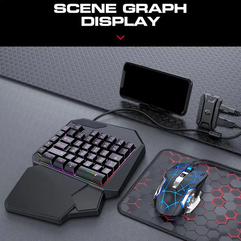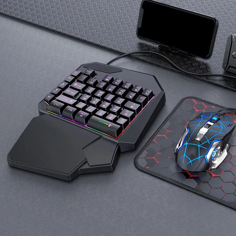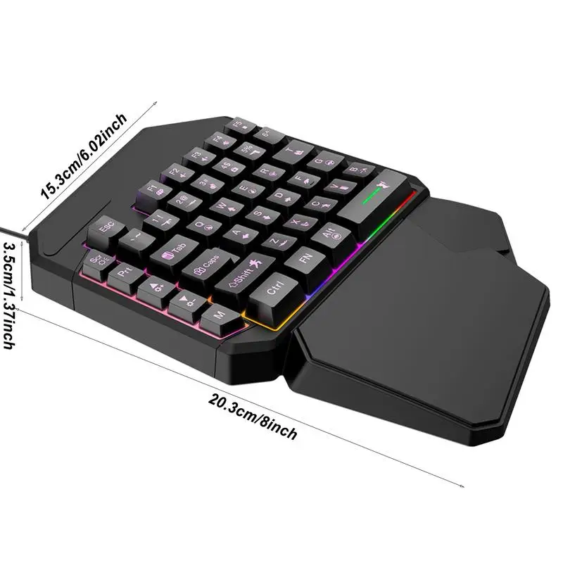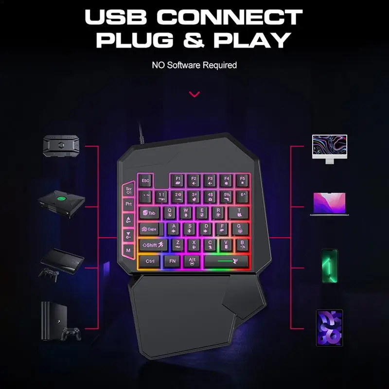 One-Handed Keyboard for efficient and smooth game or office typing. Versatile design tailored for mobile game players and professional e-sports. Simply plug the USB into your phone and customize the keys to your liking. Lightweight and portable for on-the-going use. Experience faster and more accurate typing with ease.