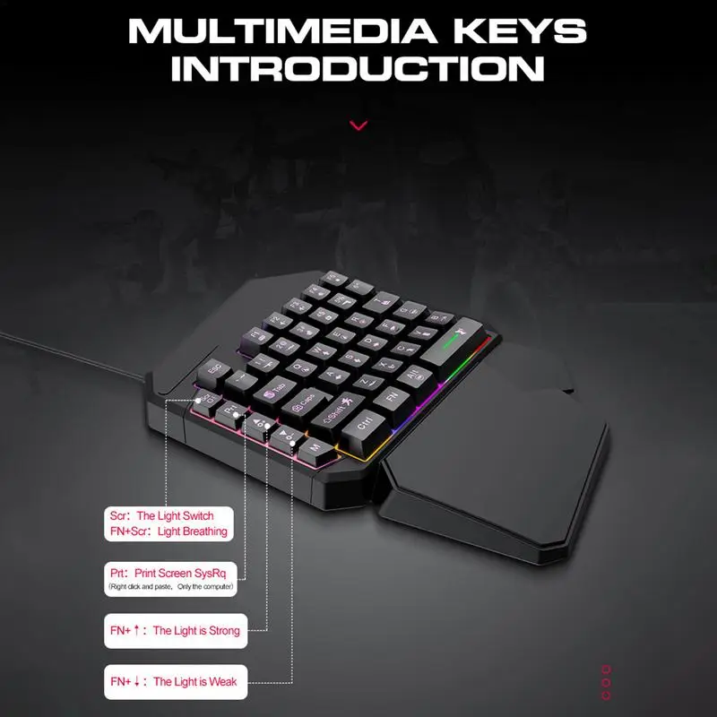 1.Convenient to Use: Due to its adoption of a USB wired connection, this one-handed game keyboard allows for effortless plug-and-play functionality: without any complicated pairings or driver installations